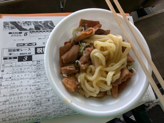 スタンド裏の食堂・寿屋で草競馬場にふさわしいローカルな味の「どてうどん」650円をかっこみ、5Rからいよいよ馬券購入。予想紙◎の(3)は外して当地リーディングジョッキー渡邊竜也騎乗の(6)を頭に馬単(6)(2)、(6)(4)の2点勝負。