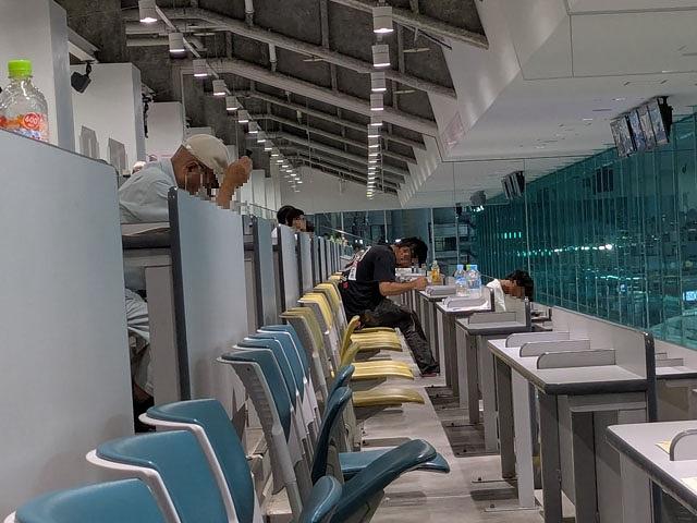 暑くて路上にいられないので、第1Rにはまだ1時間あるものの無料バスに乗り込んでエアコンの効いた競艇場内へ避難。舟券を1Rから買うってことは、恐怖の負け戦が8つもあるということだ。