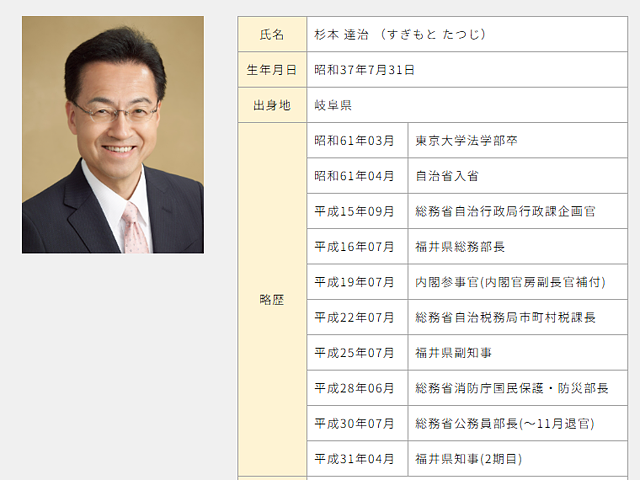 杉本氏は東大法学部卒で、1986年に当時の自治省(現・総務省)に入省。長野県、徳島市、山形県など地方勤務などを経験し、’04年、初めて福井県勤務となり総務部長に就任した。3年間の勤務の後、内閣参事官となり、’13年に再び福井県に戻り、副知事となった。その後、総務省を経て’19年の福井県知事選に出馬し初当選。セクハラ発覚時は2期目だった。
