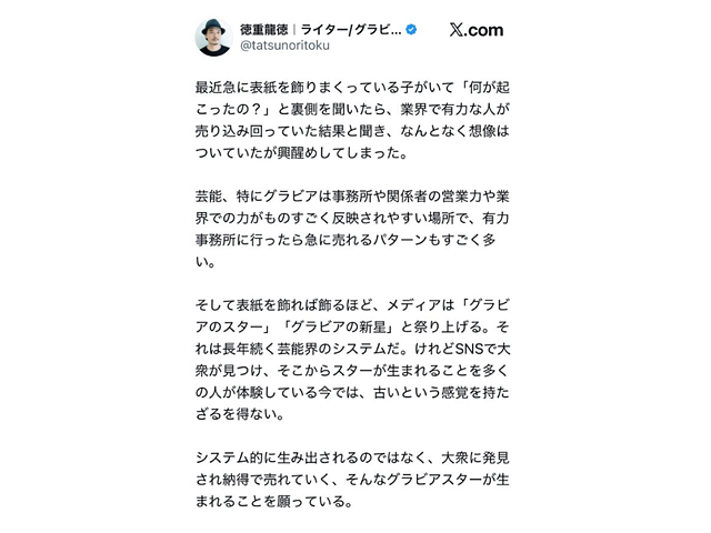 グラビア評論家として活動するライターの徳重龍徳氏が、X上で行った投稿が波紋を広げている。