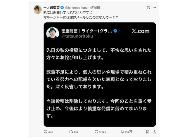 炎上後、徳重氏は問題の投稿を削除し、マネージャーには謝罪メールを送ったという。しかし、一ノ瀬本人への連絡はなかったとされる。